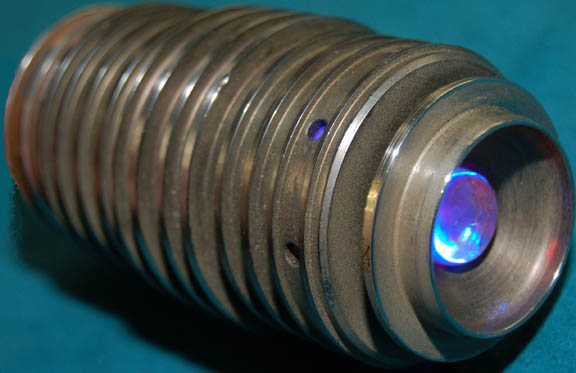 Description: An electronic device made for use on Star Trek episodic television. The cylinder is made of metal with grooves around its circumference and applications for detail. A button on the bottom activates twinkling magenta and blue lights at the tip and through the holes around the top. It is powered by a standard 9Volt battery (not included). Measures approx. 5 x 2 ¼ inches.