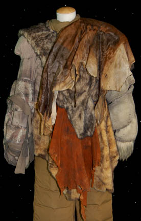 Description: A costume featured in Star Trek VI: The Undiscovered Country for wear by William Morgan Sheppard in his portrayal of the Klingon commandant of Rura Penthe prison. The costume reflects the needs of a character operating in such an inhospitable environment. It is composed of tan colored thickly padded Cabela's name brand huntin trousers, gray trousers for wear over the others with a costumer’s tag reading ‘Klingon Commandant’, and a Cabela’s hunting jacket altered to include various animal skins, several of which are believed to be real, other synthetic. The costume is made to appear thrown together from multiple components to make life more comfortable working on a frozen asteroid.