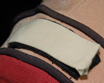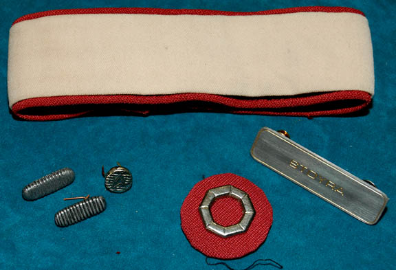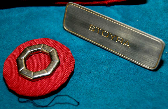 Description: A crewman's uniform of the style appearing in various Star Trek feature films. The costume is a red jumpsuit with black accents and a tan yoke. The costume features affixed white command division strips on the shoulders and a black ribbed collar and cuffs. These unattached elements are also included; A red trimmed white division strip, two unattached silver colored metal commendation bars and a ’10 year service’ pin featuring the Starfleet logo etched into the center, a red placement with an affixed silver colored metal ‘petty officer 2nd class’ rank badge, and a silver colored name badge with the etched in name ‘STOYRA’. At this time, this costume is the single remaining crewman’s uniform yet located with affixed command division shoulder strips.