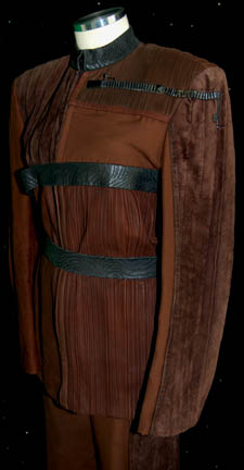 Description: A costume featured in part one of the stunning Star Trek: Voyager two-part episode “Year of Hell”; wherein “Voyager” encounters an obsessed Krenim captain in command of an immense ship with the power to alter history itself and comes under almost constant attack from warships of the same race. This costume consists of a long-sleeved jacket featuring multiple shades of brown and multiple textures of leather and suede with attached rank pin under the left shoulder. Three black leather straps with textured stripes; one around the collar, one across the chest, and the last around waist that attach via clasps, matching leather trousers with black fabric sewn onto the leg cuffs. A sewn in tag reads ‘Voyager, Adrian Tafoya' and the costumer’s tag reads ‘176 Year of Hell, Krenim, Adrian Tafoya’.