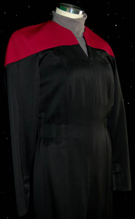 Description: A female Command Red Starfleet uniform made for wear during the Star Trek: Voyager series. The uniform is black with Command red shoulders, a small Velcro patch on the left breast for a Combadge (not included) to attach, a zip up the front and two pleats in the back. Around the waist are loops for away-team gear (not included) to attach. A gray long sleeved undershirt accompanies the jumpsuit. Costume comes complete with costume tag.