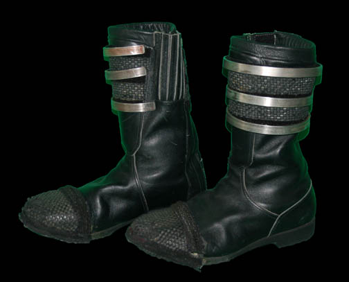 Description: The ‘Ellora' were a primitive race that appeared in the Star Trek: Insurrection feature film as the indentured servants to the more powerful ‘Son’a’. This jumpsuit was worn by an Elloran officer serving on board the Son’a “Ru’afo’s” (F. Murray Abraham) flagship. Made of blue velvet, the jumpsuit has black rubber capillary detail strips around the arms and body. There are also Velcro areas on each side of the waist where metal ribs mounted on silver vinyl attach. A mottled brown dickie worn under the jumpsuit is also included. Black boots with capillary rubber trim accompany the costume. Each boot comes with three egg shaped rings that are designed to go around the top. In some cases the rings have come loose and may need to be reattached with glue.