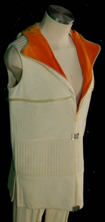 Description: An extremely soft cream colored sickbay patient costume featured in Star Trek I: The Motion Picture. The costume is trousers and a matching sleeveless shirt with a hood that features a faded yellow interior lining. Both costume pieces feature clear plastic tubing affixed by way of silver colored foil attachments. The costume is intended for female wearers.