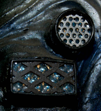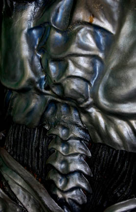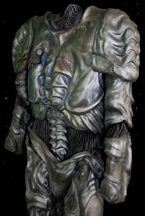 Description: The Hirogens are a strong nomadic race of hunters featured in multiple Star Trek: Voyager episodes including “Message in a Bottle” and “Hunters”. A black full length cast rubber body suit painted with silver details to give it an armored appearance, with matching gloves, and boots. A secondary bonus pair of boots is also included. The right breast features a pair of green lights that are molded into the costume and activated by a battery box housed behind the left shoulder. It is hidden under the encasing back mold. It requires four AA batteries (not included) to operate the lights. This costume would have made appearances in episodes like “Flesh and Blood, Part I” and “Hunters”. Due to time, use and storage the costume has significant wear, most notably around the shoulders. Costume comes complete with costume tag.