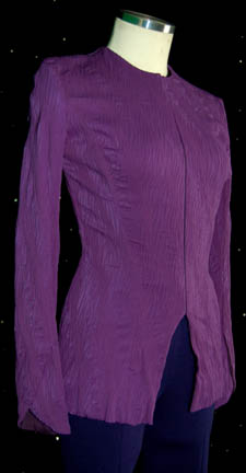 Description: A costume made for wear by Jolene Blalock in her portrayal of “T'Pol”. The costume appears in the Star Trek: Enterprise episode “Fusion” during a scene in which T’Pol mindmelds with another Vulcan for the first time, a practice that is perceived as deviant by Vulcan society. The costume is a form fitting purple jumpsuit with a black sleeveless bust attached and comes with a form fitting purple textured fabric top that features Vulcan wraparound cuffs. The costume garments feature sewn in Enterprise tags reading ‘Jolene Blalock’ and the costumer’s tag reads ‘”T’Pol” Jolene Blalock Enterprise’ and lists the components.