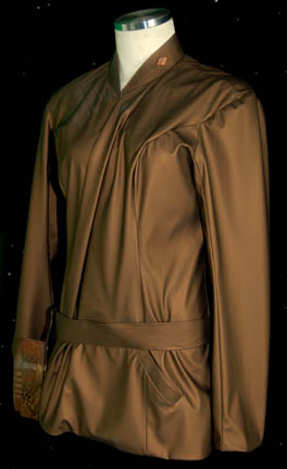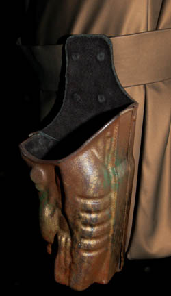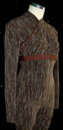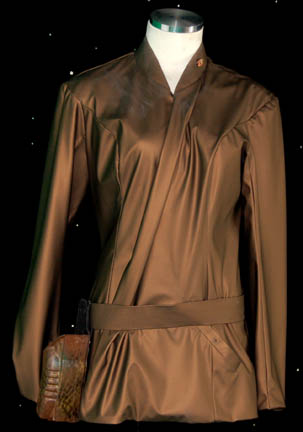 Description: A costume featured in “Broken Bow” the pilot episode of Star Trek: Enterprise for wear by Jolene Blalock in her portrayal of “T'Pol”. The costume is a form fitting Vulcan camouflage uniform with an affixed belt, a cold climate Vulcan jacket, a holster and two belts. The uniform is unfinished at the cuffs of the legs though this does not detract from the overall appearance of the costume. The jacket has an unfinished appearance on the inside, though it is complete, with an asymmetrical double front that clasps closed on thread loops, is copper colored and comes with two matching belts made from the same vinyl or PVC material. The pockets of the jacket and the inside folds retain special effects ‘snow’ used during production in scenes taking place on Rigel X. The holster is tough vacuum formed plastic with a military clip affixed to the inside, ‘Jolene’ is penned onto the inside, the holster is painted to match the Vulcan camouflage and is made to fit an EM-33 energy pistol (sold separately).