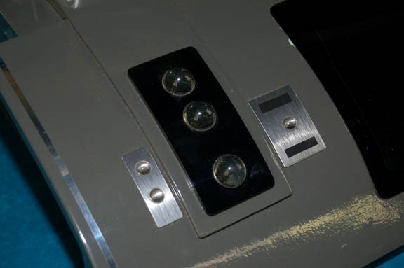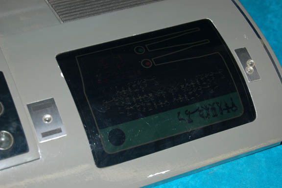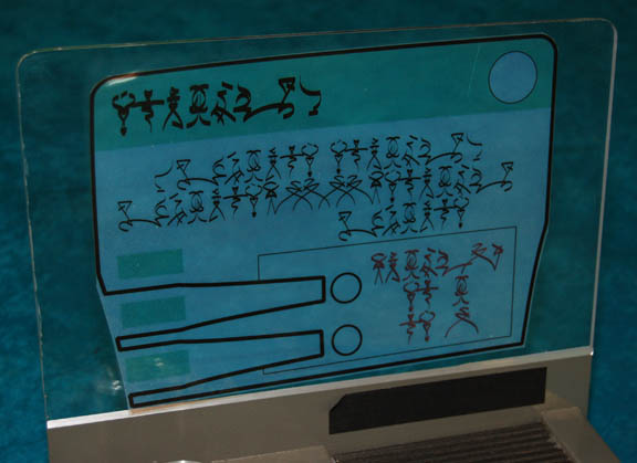 Description: A prop item featured in the Star Trek: Enterprise episode “Detained”; wherein “Captain Archer” (Scott Bakula) and “Ensign Mayweather” (Anthony Montgomery) accidentally stray into a militarized zone, are taken into custody by a race called the Tandarans, and imprisoned along with a number of Suliban. This item is a Tandaran computer console that was sitting on “Colonel Grat's” (Dean Stockwell) desk in the prison where “Archer” and “Mayweather” were being held; it has a brown outer casing, silver-colored lines of detail, a general rounded design featuring a piece of smoked acrylic with Tandaran script, several faux “buttons”, a metal-colored, round accent that summons imagery of an aperture. Black textured detail leading to a large, clear, acrylic “view screen” with a graphical application of more Tandaran script upon it. The item measures approx. 12 X 14 X 12.5 inches.
