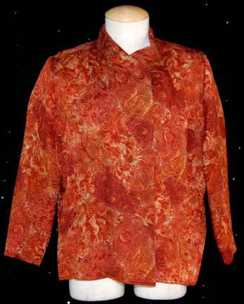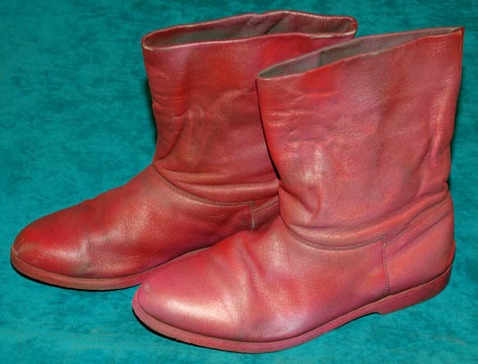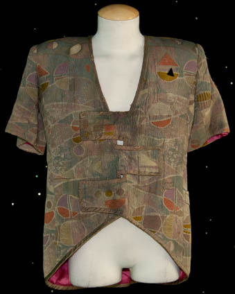Description: A lot of items featured variously throughout Star Trek: Voyager episodic television. This lot is for wear by Ethan Phillips in the role of “Neelix” and consists of a long-sleeved, rust-colored, chenille shirt featuring textured stripes down the front and back, a pleated flap across the front that covers the buttons, several layered, false cuffs, a long-sleeved, raised, paisley-print shirt in a further rust motif with buttons down the front. Multi-colored vertically striped trousers with a fish scale design, a short-sleeved, beige jacket featuring an abstract pattern of shapes in different sizes and colors as was a running motif with garments for the character; flaps that connect across the stomach, a Velcro patch for a commbadge (not included), and is distressed for effect. Also included is a red harness featuring gold-colored accents with metal-colored rivets, a yellow painted tricorder and phaser holster that clip to a belt, and dark-pink leather boots. Several sewn in tags read ‘Voyager, Ethan Phillips' whereas the trousers denote reuse by a “George Colucci”, a known Trek stunt man.