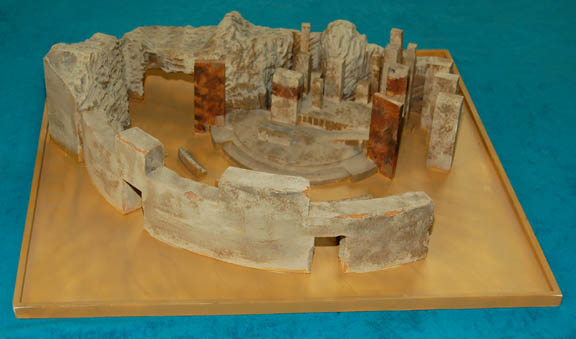 Description: A model of a set featured in the Star Trek: Voyager episode “Muse”; wherein “B'Elanna Torres” (Roxann Dawson) is trapped on a primitive planet she finds a local man who is writing plays about the logs of hers he had heard while she was unconscious. This item is a model of the amphitheatre where the plays about the “Eternals” of “Voyager” were held; it is has a wooden base, foam rocks and walls, a stage and a wooden stage, pillars, and seats. The item measures approx. 19 X 19 X 4.5 inches.