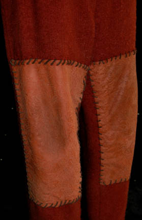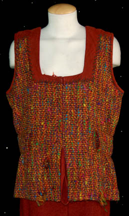 Description: A costume featured in the Star Trek: Deep Space Nine episode “Progress”; wherein a farmer and his friends refuse to leave their dwelling on one of Bajor's moons even though it is going to be made uninhabitable because of a plan by the Provisional Government to use the molten core to generate energy. This costume is for wear by Brian Keith in the role of one of the farmers who would not leave their home even though it would soon be uninhabitable, “Mullibok”, and consists of two matching rust-colored, faux-suede vests featuring a multi-colored, boucle` woven fabric sewn on with leather cord and a pair of rust-colored, overall-style trousers with oversized patches of the same faux-suede sewn on with the same leather cord. A sewn in tag reads ‘Deep Space Nine, Brian Keith’ but an additional tag denotes reuse.