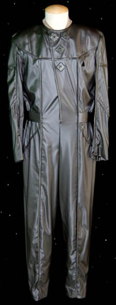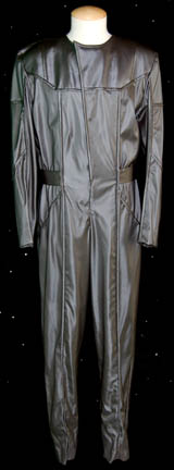 Description: A lot of two costumes featured in the Star Trek: Voyager episode “Alice”; wherein “Tom Paris” (Robert Duncan McNeill) rescues a supposedly haunted shuttle that has a neurogenic interface that begins to affect his mind. This lot consists of version one and two of the specialized jumpsuit for wear by Robert Duncan McNeill in the role of the flight controller on the Starship “Voyager”; the first version is a sleeveless, gray undershirt in a stretchy, spandex-like material, a long-sleeved, full-length, metallic gray, vinyl jumpsuit featuring raised trim down the front and back, loosely around the collar, and down the arms. Magnetic buttons hidden by the flap of the garment, stirrups for the feet, and a matching, attached belt. The second version is identical to the first except that there are four diamond-shaped, resin cast “neurogenic interfaces” placed under the collar and a Velcro patch for a commbadge (not included). All three garments feature a sewn in tag that reads ‘Voyager, Robert McNeill' and a costumer’s tag reads ‘Robbie McNeill, #226, Paris flight suit, version 1 & 2’.