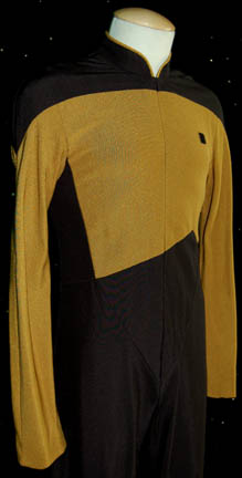 Description: A Star Trek: The Next Generation male Operations gold Starfleet uniform made for wear during the series and/or ‘The Next Generation' movies. The jumpsuit is black with Operations gold sleeves and upper torso. There is gold trim around the collar, a small Velcro patch on the left breast for a Combadge (not included) to attach and a zip up the front. Costume comes with costume tag.