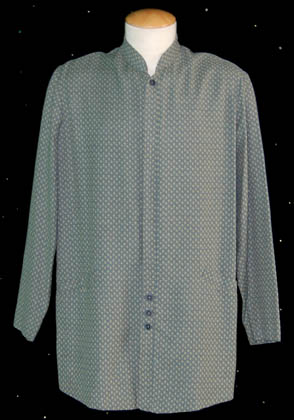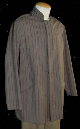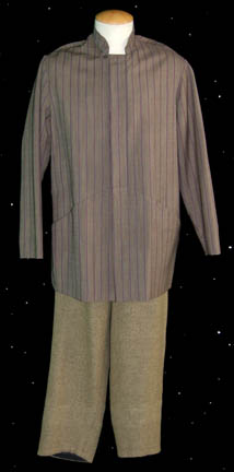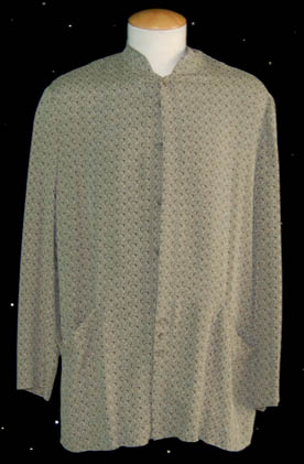 Description: A lot of three costume shirts and a set of trousers made for wear by John Billingsley in his portrayal of “Dr. Phlox”. The trousers are soft tan wool knit and the shirts are long sleeve button front shirts made form varying colors and patterns, some with waist pockets, some with character specific button patterns. Not all of the garments feature sewn in Enterprise tags, though the ones that do read ‘John Billingsley' and the ones that don’t were located with the others in the John Billingsley collection.