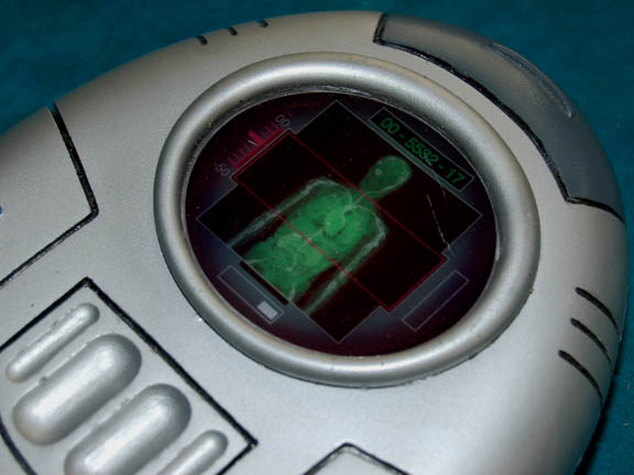 Description: A PADD (Personal Access Display Device) featured in the Star Trek: Enterprise episode “Regeneration”. The item is sturdy molded rubber painted metallic silver with black accents and faux blue lights along the left and features a graphical application of a scanned humanoid inset into the ovular ‘display screen'. The item measures approx. 8 X 5.5 X 1.5 inches.