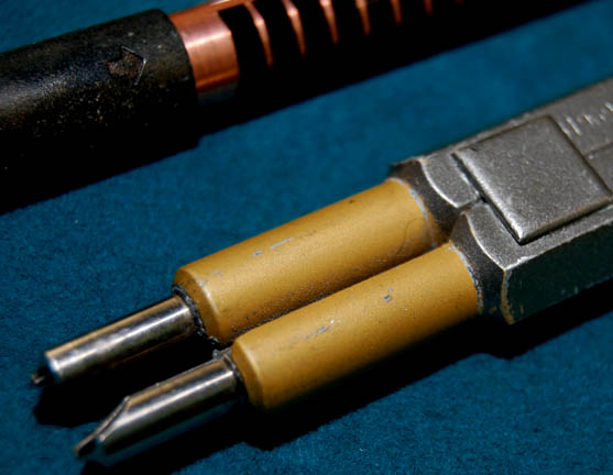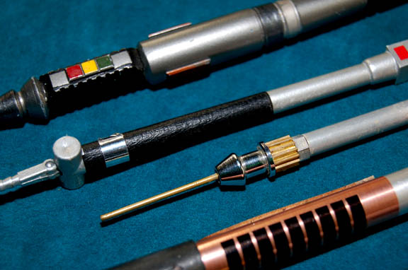 Description: A random assortment of five 24th century style engineering tools made for use on Star Trek episodic television. The longest tool is made of resin painted gray, black and copper color with colored faux buttons and a long metal tip. Also included is a metal tool wrapped in a copper colored application with black accents and black rubber tip, a metal double headed faux screwdriver, a plastic silver colored tool with black and red applications and a small metal tool with gold colored metal accents. Largest tool measures approx. 8 x ½ inches diameter.