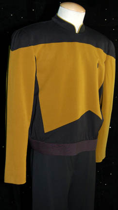 Description: A Starfleet operations gold uniform in the third season style made for wear on the Star Trek: The Next Generation series. The jacket is gold and black with gold trim around the collar. It has a zip and snaps up the back and a small Velcro patch on the front for a Combadge (not included) to attach. Due to time and storage there is fading on the left sleeve. The corresponding trousers are black. Costume comes complete with costume tag that reads, “TNG – Tom Morga, Michael Mack”