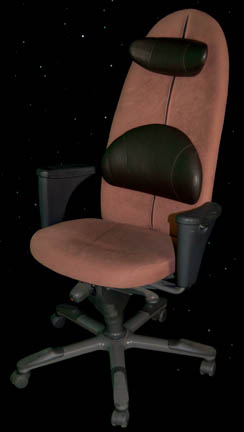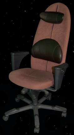 Description: A piece of set dressing of the style used in the briefing room on Star Trek: Voyager and other series. The chair is brown and black computer chair with wheel bases, armrests, and adjustable lumbar/head supports. The item measures approx. 31 X 19 X 48 inches.