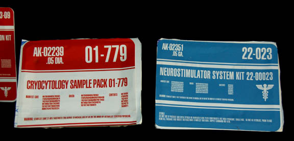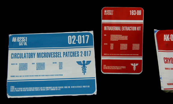 Description: STAR TREK: ENT “MEDICAL SUPPLIES LOT” A lot of four medical supplies containers made for use on the Star Trek: Enterprise series. Each item contains actual medical supplies (not for use) with Starfleet medical labels applied on the top for detail. Two labels are blue and two are red. Largest piece measures approx. 7 ½ x 6 x 3 ½ inches.