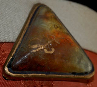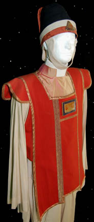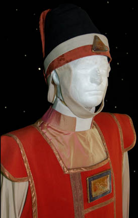 Description: The Vulcans are a humanoid race from the plant Vulcan who are known for their great sense of logic and stoic nature. They were one of the instrumental species responsible for establishing the United Federation of Planets. This Vulcan costume was made for wear during the filming of Star Trek VI – The Undiscovered Country at the Khitomer Conference. It includes a tan shirt with bell sleeves and an orange silk chest and collar section. The corresponding trousers are drawstring and also tan colored. The tabard is rust color with copper fabric trim and a resin badge in the center featuring Vulcan iconography. The accompanying hat is made of shaped black felt with orange patterned padded fabric, a tan and orange band and a tan chin strap. Attached to the front is a resin Vulcan decoration. Due to time and use the top of the hat is slightly dented.