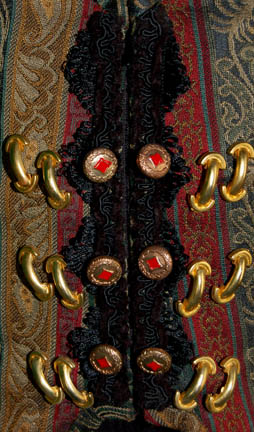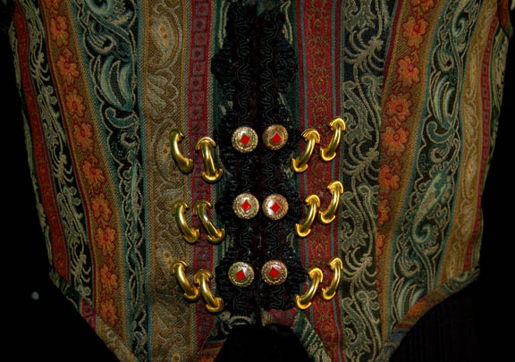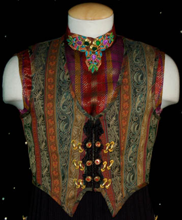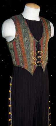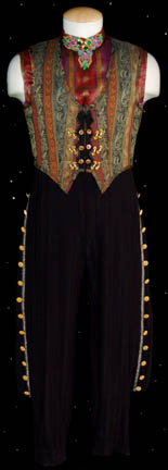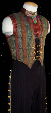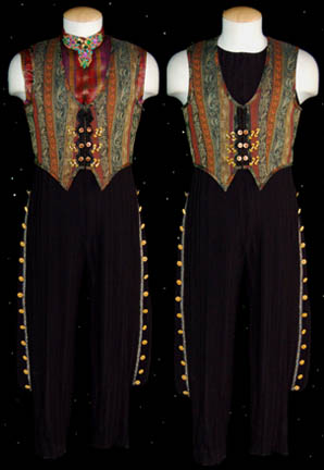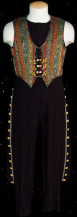 Description: “Brunt” was played by notable Star Trek actor “Jeffrey Combs” and was a Ferengi liquidator for the Ferengi Commerce Authority featured in the Star Trek: Deep Space Nine episode, “Family Business”. This costume lot includes two black sleeveless jumpsuits with pleats down the length and gold colored metal buttons down the wings. One was made for wear by Combs and has a sewn in tag that reads, “Deep Space Nine, Jeffery Combs”. The other was made for wear by his stunt double. There are two waistcoats, each patterned in multicolored fabric with black lace and metal accents on the front. Like the jumpsuits one was made for wear by Combs and has a sewn in tag that reads, “Deep Space Nine, Jeffery Combs”. The other was made for wear by his stunt double. Also included is one sleeveless top in a multicolored check pattern with detailed collar. It was made for wear by Brunt's stunt double. The accompanying costume tags read, “DS9 #469, Brunt, Jeffrey Combs” and “Stunt Brunt”.