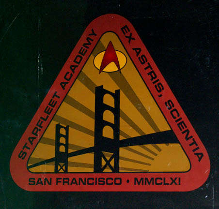 Description: A piece of set dressing featured in the Star Trek: Voyager episode “Non Sequitar”; wherein “Harry Kim” (Garrett Wang) wakes to an alternate reality where he was never assigned to “Voyager”. This item is a large, rectangular piece of smoked acrylic in the LCARS (Library Computer Access and Retrieval System) style, featuring gray detail along the top and bottom, graphical applications of the Starfleet Academy logo with the words “Starfleet Academy, San Francisco, Ex Astris Scientia” and the date 2163 in roman numerals along the outside of the triangle. The item measures approx. 55 X 34 inches with a negligible height.