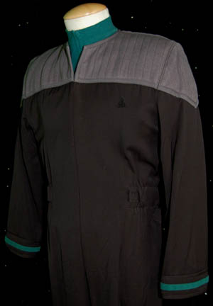Description: A Star Trek: Deep Space Nine male Sciences Blue Starfleet uniform made for wear during the series. The jumpsuit is black with gray quilted shoulders, blue trim around the cuffs, Away Team gear loops around the waist, a zip up the front and a small Velcro patch on the left breast for a combadge (not included) to attach. Worn underneath is a long sleeved Sciences Blue shirt also with a zip up the front. Costume comes complete with costume tag.
