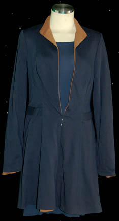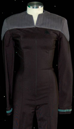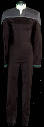 Description: A lot of costumes and costume aspects featured variously in Star Trek: The Next Generation and in the Star Trek feature films. This lot is for wear Gates McFadden in the role of “Dr. Beverly Crusher” and Wil Wheaton in the role of her son the prodigy, “Wesley Crusher”; it consists of one of “Dr. Crusher's” now trademark light-blue long-sleeved lab coats with a Velcro patch for a commbadge ?(not included), a long-sleeved, deep blue-colored blouse that sits wide on the shoulders, a long-sleeved jacket matching the blouse in color and with tan, faux-suede accents around the collar, white leggings and the special belt/harness featured in the episode “Yesterday’s Enterprise”. Also included is a “First Contact-style” Starfleet uniform, called this because it was first used in the feature film of the same name and went on to become the standard; it consists of a long-sleeved, full-length, black jumpsuit featuring blue-gray, quilted shoulders, a Velcro patch for a commbadge (not included), hoops on the waist for tools, a long-sleeved undershirt in Sciences Blue with matching division colors around the cuffs of the jumpsuit. A sewn in tag reads merely “Crusher” but a costumer’s tag reads ‘TNG Season 4-7, Crusher, Gates McFadden, Lab coats’.