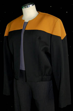 Description: “Harry Kim” (Garrett Wang) was the Operations Manager onboard the U.S.S. Voyager during the Star Trek: Voyager series. This Starfleet uniform lot includes a black jacket with operations gold shoulders and a small Velcro patch for a combadge (sold separately) to attach. The accompanying costume tag reads, “Harry Kim, Garrett Wang, Voyager, 2 gold and black Starfleet uniform jackets” however only one is available and being sold in this lot. Two pairs of gray trousers are included that have elastic waists. There are no sewn in tags or costume tag but they are believed to be Harry Kim's since they were located in his section of the warehouse. Four gray Starfleet tops are included. Two are sleeveless with a zip up the back, one is a gray t-shirt also with a zip up the back and the last is a gray t-shirt with built-in shorts and a zip up the back. The sewn in tag in the last item reads “Voyager – Garrett Wang”. A costume tag comes with the gray tops that reads, “Harry Kim, Garrett Wang, Voyager, 5 gray Starfleet tops – 2 tank, 2 short sleeves, 1 short sleeve w/ built-in girdle”. Please note that the tag indicates 5 tops however only four are available and in this lot.
