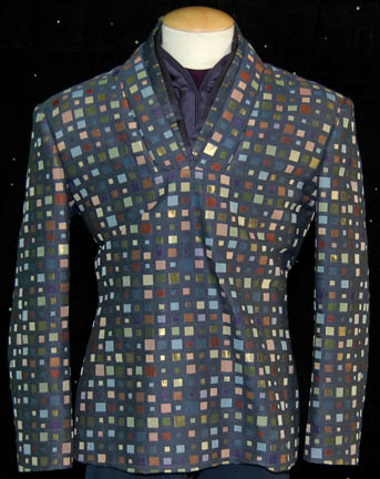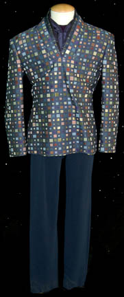 Description: The Romulans are a warrior civilization from the planets Romulus and Remus who founded their Romulan Star Empire two thousand years ago. This male Romulan costume was made for wear during Star Trek X: Nemesis and includes a blue jacket-style top with multicolored squares and a triple padded collar. Worn underneath is a dark blue short-sleeved top and a blue silk dickie. The corresponding trousers are navy blue. Attached to the front of the jacket is a gray resin Romulan Bird-of-Prey emblem pin. Costume comes complete with costume tag that reads, “ST X – Nemesis”. Also included is a brown Romulan wig that was made for use for the filming of Nemesis but according to the accompanying costume tag it was not used.