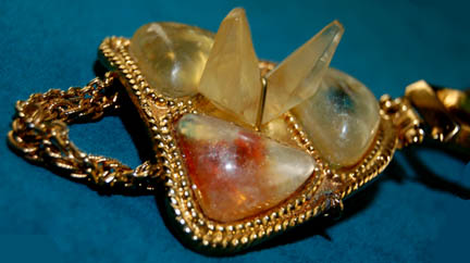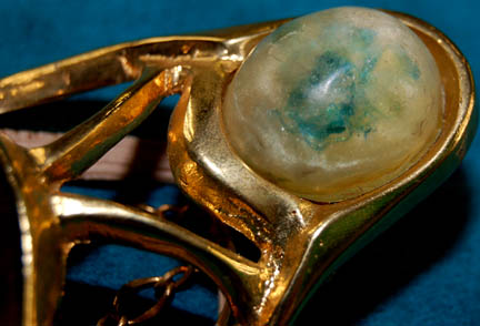 Description: A prop item featured in the third Star Trek feature film, “The Search for Spock”; wherein the Original Series crew hijacks the “Enterprise” and return to the newly created Genesis Planet to retrieve “Spock” and take him back to Vulcan. This item is a bracelet piece of costume jewelry worn by one of the handmaidens in the processional of Spock's body to reintegrate his katra into his body, it is gold-colored metal that consist of two parts: the first part features vaguely triangular shapes with a housing for a cloudy white and green “gem”, a strap/chain the goes around the wrist, a hinge that sets where the wrist would be, three triangular “gems” similar to the first, two “crystals” in the middle, on gold-colored setting with textured accents, a second chain around the hand and a final one that secures around the middle finger. The item measures approx. 8 X 3 X 2 and has the name “Lita” written on the underside.