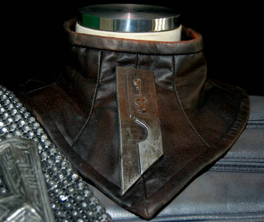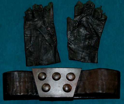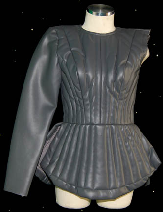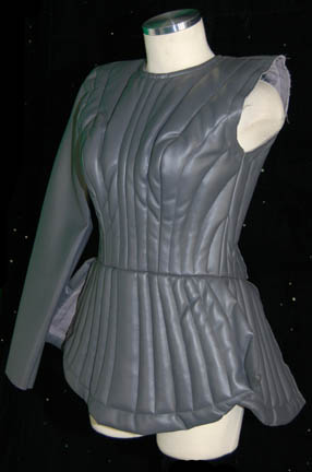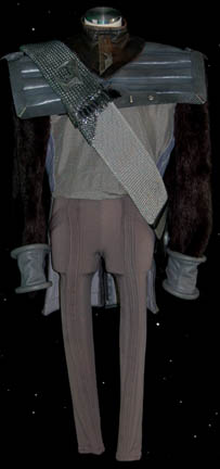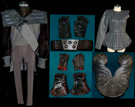 Description: A lot of Klingon costume aspects similar to those featured throughout all three 24th century Star Trek series and Star Trek V: The Final Frontier. This lot of female Klingon warrior costume aspects consists of gray trousers that have pleats down the front and back and around the sides, stirrups at the feet, and are for wear by Spice Williams in the role of “Vixis” in “The Final Frontier”; an unfinished, gray, vinyl quilted tunic with an unattached arm and two extra arms that are quilted. A gray, pleated, sleeveless undershirt, gray, fiberglass chest piece, a baldric sash, for wear by Marlene Sosebee in the DS9 episode “Tacking into the Wind”, featuring studded “metal” tabs and “chainmail” with Klingon house glyph; a dark-gray, quilted vinyl coat, for wear by Cathy Demor in an uncredited role on DS9, with matching shoulder armor, textured, diamond-shaped accents and black, faux-fur sleeves. Included is a pair of the black gloves with half the fingers cut off, a matching belt, and choker with a unique, metal house insignia; a pair of gauntlets and gloves for wear by Sandra Nelson in the role of “Tavana” on DS9, two, black leather chokers with symbols of different Klingon house on them, and two gray, vinyl gauntlets for wear by Thelma Lee in the role of “Kahlest” on the TNG episode “The Sins of the Father”. Sewn in or otherwise labeled tags are as listed.