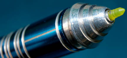 Description: A Starfleet medical device used by the “Doctor” (Robert Picardo) on “7 of 9's” (Jeri Ryan) Borg implant above her eye in the Star Trek: Voyager episode, “Equinox”. The device is made of metal with a section colored metallic blue and a black plastic syringe top. When the top is pressed in a clear acrylic tip protrudes out of the device that glows green. There is not much juice left in the original battery and should be replaced for the full effect. It requires a single V28PKL (aka 2CR-1/3N) battery that is accessed by removing the tip and pulling out the inner compartment. Extra battery included. Measures approx. 6 ¾ x 1 ¼ inches diameter.