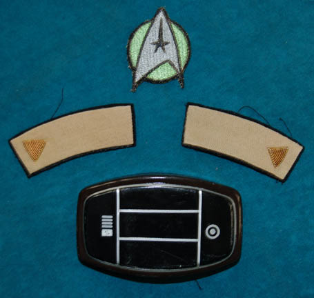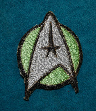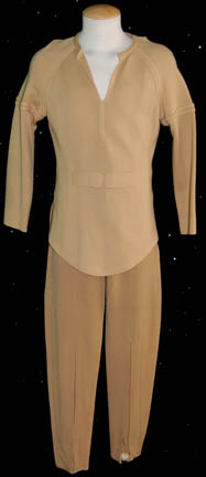 Description: A tan colored Class-B Starfleet uniform featured in Star Trek I: The Motion Picture. The item is tan trousers with a matching tan long sleeved uniform top and comes with these unattached elements: a bio-monitor, a pair of medical division-rank strips with gold thread triangle embellishments indicating the wearer to be a ‘petty officer', and a green backed Starfleet emblem patch for the left breast. The costume is intended for male wearers.
