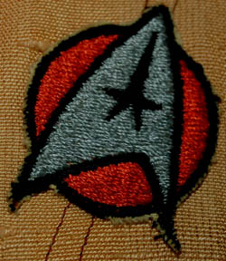 Description: An out of the ordinary Starfleet uniform top believed to have been made for Star Trek I: The Motion Picture. The costume is reminiscent of Vulcan electricians and technicians appearing in Star Trek IV: The Voyage Home but does not feature buttons on the neckline. The shirt has elastic cuffs and a sciences orange backed Starfleet emblem patch on the left breast and a sewn in Paramount tag on the neckline interior. The costume is intended for a male wearer.