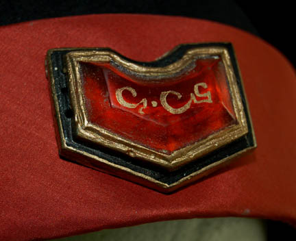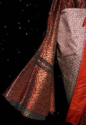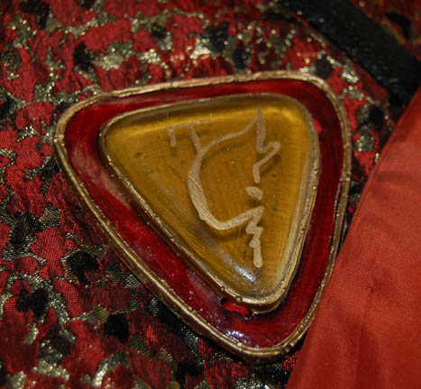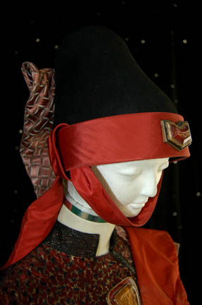 Description: The Vulcans are a humanoid race from the plant Vulcan who are known for their great sense of logic and stoic nature. They were one of the instrumental species responsible for establishing the United Federation of Planets. This impressive Vulcan robe costume was made for wear during the Star Trek feature films. It includes a beautiful red, black and gold robe with black trim and bell sleeves. An inverted triangular resin embellishment is on the chest with Vulcan iconography painted in gold in the center. Worn over the robe is a patterned sash with rust color trim and a circular resin embellishment at the top. Also included is a black shaped felt hat with a padded section at the back, rust colored band and chin strap and a resin Vulcan embellishment on the front.