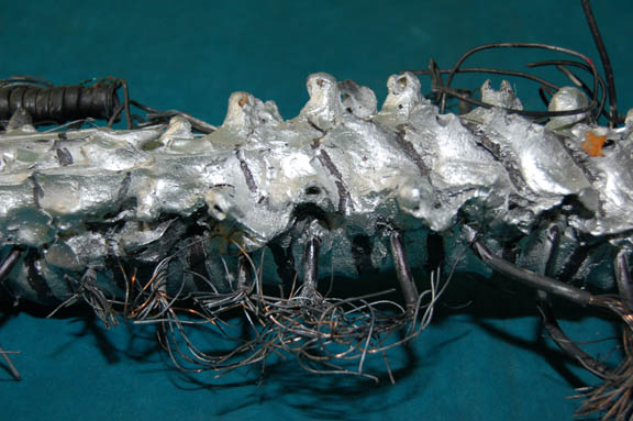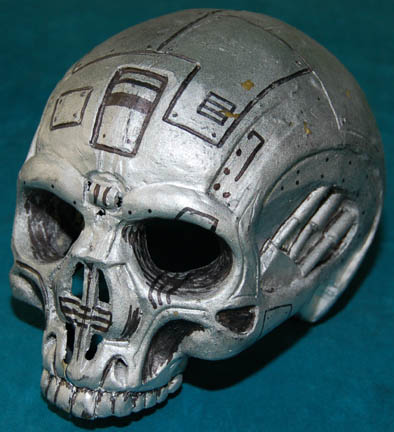 Description: A lot of Borg skeletal remains featured as set dressing in various Star Trek series and movies. This lot consists of a acrylic cast skull, painted silver featuring textured black detail dividing the skull into compartments with “screw” holes securing them; a similar skull minus its jaw and half of the back of the skull but resin cast instead of acrylic, and a matching spinal column featuring numerous wires, jacketed and bare, jetting out from between the vertebrate and a rigid cord with a threaded umbilicus. Measurements are as follows; the full skull measures approx. 8 X 7 X 6, the smaller one 8 X 5 X 5, and the spine measures approx. 18 X 7 X 4 inches.