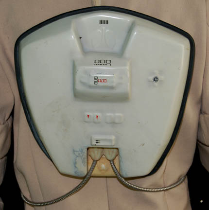 Description: A costume appearing in various Star Trek feature films like Star Trek I: The Motion Picture, Star Trek II: The Wrath of Khan, and Star Trek III: The Search for Spock. The costume is a full length jumpsuit colored beige with thick lines of padding around the sleeves and legs. The jumpsuit features placements for accompanying vacuum formed gear that is molded with details suggesting hardware, connected to one another with metal wrapped cables, one of which is broken loose from the front piece position on the right side, but can easily be placed back within its housing. The costume comes with boots that were not located with the lot, but fit its overall appearance despite their being distressed to appear ‘dirty'.
