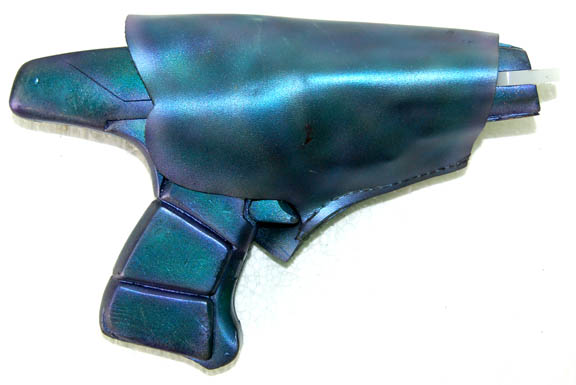Description: When the mysterious “Xindi” attacked Earth without provocation they left in their wake a death toll of seven million. The mission of the “Enterprise NX-01” changed overnight as they entered the treacherous ‘Delphic Expanse' to locate the “Xindi”. It took a while but when they accomplished their goal they met with severe resistance and it came in the form of reptilian shock troops and strange new weapons. This item is one of those; a Xindi-Reptillian hand gun the likes of which were featured in episodes like “Carpenter Street”. The gun is sturdy molded rubber painted metallic blue with purple highlights, it features a white acrylic emission tip at the front. This one comes complete with a leather holster painted to match the weapon with a military style belt attachment for costume wear. It measures approx. 10 X 6.5 X 3 inches in the holster.
