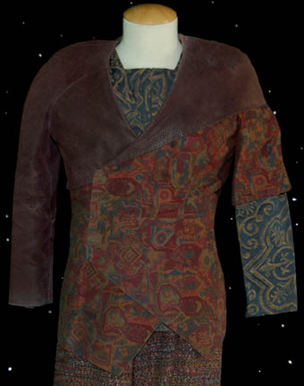 Description: A costume featured in the Star Trek: Deep Space Nine episode “Tacking into the Wind”; wherein “Chancellor Gowron” (Robert O'Reilly) begins reckless attacks against the Dominion and “Colonel Kira” (Nana Visitor) and “Damar” (Casey Biggs) attempt to steal one of the Breen energy dampening weapons. This costume is for wear by Trek and cult favorite Jeffrey Combs in the role of the Vorta diplomat and ambassador to Cardassia “Weyoun”, it consists of two long-sleeved, teal and gold-colored shirts featuring a design that summons imagery of a Victorian frieze or ancient cartographer’s symbol and pleating just under the collar. A jacket with one long sleeve and one short featuring an abstract, multi-colored pattern in an asymmetrical design with buttons and clasps down the front; purple faux-suede accents across the shoulders and down the long sleeve, and two multicolored, overall-style trousers with stirrups for the feet. Jeffrey Combs has the distinction of being one of only a scant few actors to appear in more than seven roles in the various Star Trek series. Sewn in tags read ‘Deep Space Nine, Jeffrey Combs’ and ‘Dennis Christopher’ as the Vorta “Borath” in the episode “The Search: Part II”; the costumer’s tag reads ‘Deep Space Nine, Weyoun, Jeffrey Combs’.