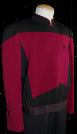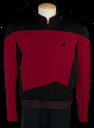 Description: “William Riker” (Jonathan Frakes) was Commanding officer during the Star Trek: The Next Generation series as well as the “Generations” movies. This Command red uniform in the third season style was made for wear by Riker on the show. The jacket is red and black with red trim around the collar. It has a zip and snaps up the back and a small Velcro patch on the front for a Combadge (not included) to attach. The sewn in tag in the jacket is incredibly faded but reads, “Star Trek: TNG – Jonathan F”. The accompanying trousers are black and appear to have been made for wear by Riker in Star Trek: VII, “Generations”. The sewn in tag reads, “Star Trek VII – Jonathan Frakes”.