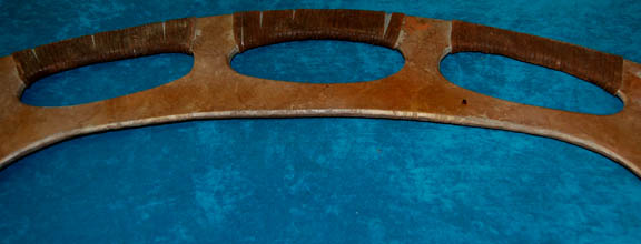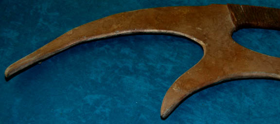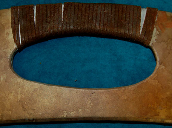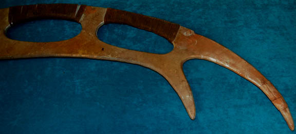 Description: A prop weapon similar to those featured throughout Star Trek episodic television in episodes involving Klingons. This item is the most popular weapon among Klingon warriors; it is a plastic-molded, crescent-shaped, double-edged scimitar with a metal frame, brown leather wrapped hand holds on the outside edge of the blade, has been painted a rust-brown and is mildly distressed for effect. The item measures approx. 41 X 8 X 1.5 inches