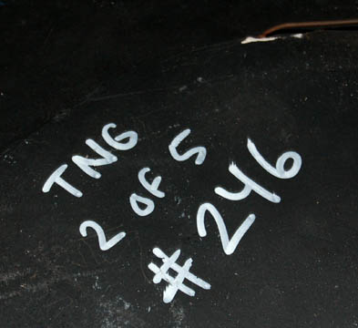 Description: This great wall decoration was made for use during the Star Trek: The Next Generation series. Made of metal covered with a thin layer of plaster, the decoration has been embossed with grids, circles and dents for detail before being in shades of black, blue, gold and gray. The back has a wire already attached for hanging and is marked on the back with “#246 TNG 2 of 5”. What makes this piece more interesting is that it was reused over and over again in different Star Trek series and locations. Measures approx. 35 inches diameter.