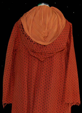 Description: A female Vulcan costume featured in the Star Trek: Enterprise episodes “Awakening” and “Kir’Shara”. The costume is a mock turtleneck tie died to appear as worn, orange and gold streaked trousers, faded to appear used, and a pumpkin colored robe with a thicker cotton woven robe with black rectangle pattern. The costume is torn and thrashed to appear worn and desert used. A sewn in Enterprise tag is present, and a costumer’s tag reading ‘Enterprise #083-084’ and listing the components.