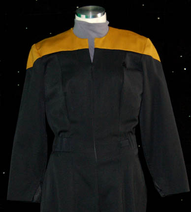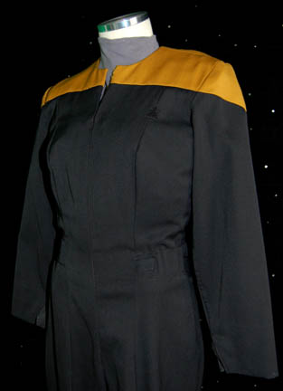 Description: A female Operations Gold Starfleet uniform made for wear during the Star Trek: Voyager series. The uniform is black with Operations gold shoulders, a small Velcro patch on the left breast for a Combadge (not included) to attach, a zip up the front and two pleats in the back. Around the waist are loops for away-team gear (not included) to attach. A gray long sleeved undershirt accompanies the jumpsuit.