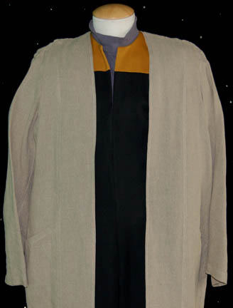 Description: A costume lot similar to that worn in the Star Trek: Voyager episode “Lifeline”; wherein “The Doctor” (Robert Picardo) is sent to the Alpha Quadrant via the MIDAS array, to treat his creator, “Lewis Zimmerman”, also played by Robert Picardo. This costume lot consists of a long-sleeved, full-length tan-colored robe with pockets in the doctor’s smock style, a Voyager/DS9-style Starfleet uniform consisting of a loose, black jumpsuit with the Operations Gold division colors along the shoulders, hoops at the waist for tools, a Velcro patch for a commbadge (not included), stirrups for the feet, and a blue-gray, long-sleeved undershirt with no rank placement of any kind. A sewn in tag on the robe reads ‘Voyager, J. R. Quinonez” as the photo dbl for “Dr. Zimmerman” and the uniform sewn in tag denotes wear by another veteran Trek stand-in and stuntman, “Steve Blalock”.