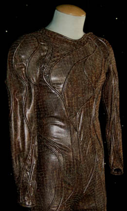 Description: A Xyrillian costume featured in the Star Trek: Enterprise episode “Unexpected”. The costume is a form fitting body suit made from stretchy reptile scale patterned material with multiple asymmetrical vein-like lengths sewn in. The costume comes with a pair of matching shoes and features a costumer’s tag reading ‘005 Unexpected, Alien Man (Xyrillians) T.L. Coleman’.
