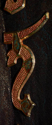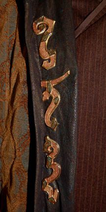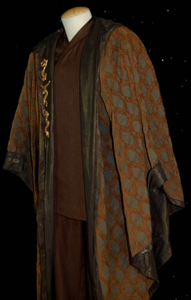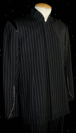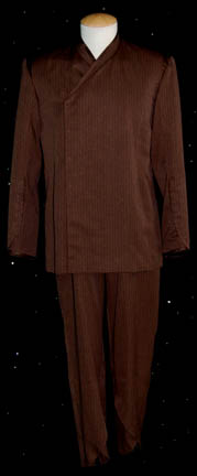 Description: A costume lot that items of were featured throughout the “Kir’Shara” story arc on Star Trek: Enterprise; “The Forge”, “Awakening”, and “Kir’Shara”. All items in this lot are for wear by Gary Graham in the role of the Vulcan Ambassador to Earth, “Soval”, it consists of a long-sleeved, wrap-around, brown pinstripe suit jacket silk-like accents and matching overall-style trousers with stirrups for the feet. A long-sleeved, midnight-blue colored suit jacket featuring vertical, gray stripes, similar silk-like accents, placket front to hide the zip and clasps, and matching overall-style trousers, with stirrups for the feet. Worn over the suits at various times during the episodes is a beautiful made long-sleeved, full-length robe in a metallic green fabric featuring a textured, copper-colored oval design dark, metallic-gold lining and trim, 36 inch bell sleeves, and metal Vulcan iconographic symbols pinned to the lapel. Pictures alone truly cannot do justice to the quality and craftsmanship that went into this garment. Sewn in tags denote that the robe was used one other actor but also indicate that both suits were worn only by Gary Graham; a sewn in tag reads ‘Enterprise 83 84 85, Soval, Gary Graham’.