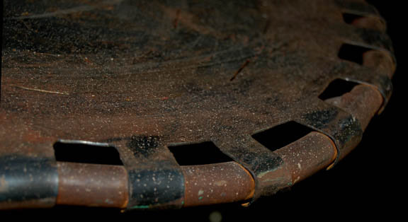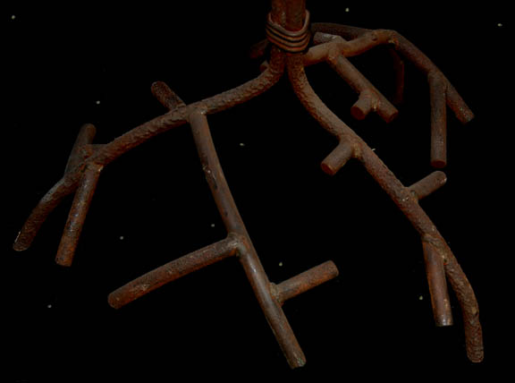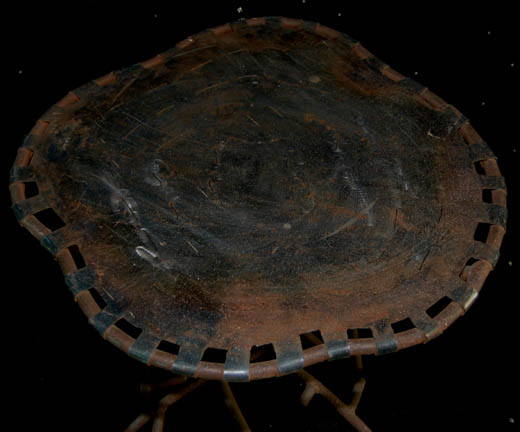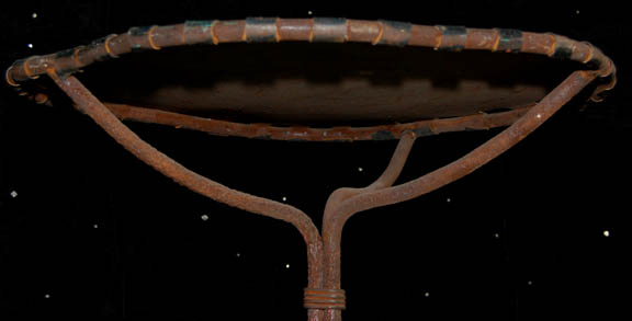 Description: This item is a table like the one seen in the Star Trek: The Next Generation episode “The Inner Light” where “Captain Picard” (Patrick Stewart) lives an entire other life as a man called “Kamin” on a planet called “Kataan”. A table like this appears in the scene where “Kamin” is playing with his grandson just before the probe that creating the scenario was launched. The table has iron legs that branch out like tree branches around and up to a sheet of iron roughly circular shaped and attached to a frame by metal tabs around its circumference. The item measures approx. 24 X 21X 24 inches and has an asymmetrical surface.
