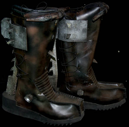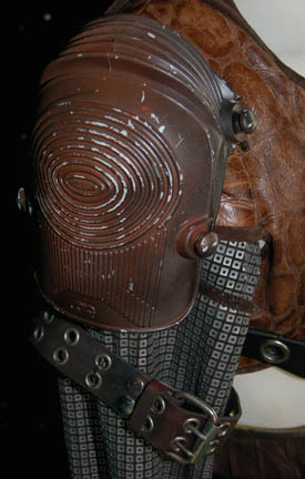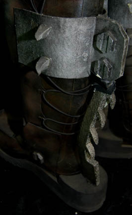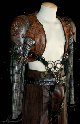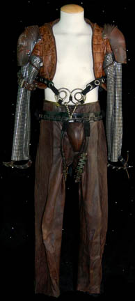 Description: A costume featured in the Star Trek: Enterprise episode “Borderland”; wherein the “Enterprise NX-01” needs the help of a convicted criminal, “Arik Soong” (Brent Spiner) to prevent a war with the Klingons being precipitated by the augmented humans from the Eugenics Wars. This costume is one of the Orion guards at the slave auction where “T’Pol” (Jolene Blalock) and several other crew members were to be sold; it consists of worn brown, leather trousers featuring darker-brown suede accents along the outsides of the legs, a built in codpiece and stirrups for the feet. A brown leather, half jacket in a faux reptile skin print, featuring “chainmail” sleeves, textured rubber shoulder armor, black, leather straps around the cuffs, an elaborate leather strap and metal ring accented harness that goes across the chest, and a black leather belt featuring braided, beaded, and intricate, textured metal accents. Included are a pair of leather, knee-high boots that have been mounted three-inch heels, several foam accents in the form of “bolts”, “spikes” and pieces of vinyl all meant to give the boots a more fearsome appearance. A sewn in tag reads ‘Enterprise, Scott Workman’ and the costumer’s tag reads ‘Enterprise #80 Broderland, Orion Guard, Scott Workman’.