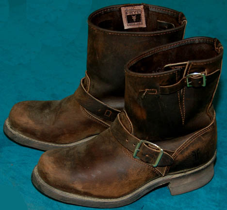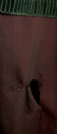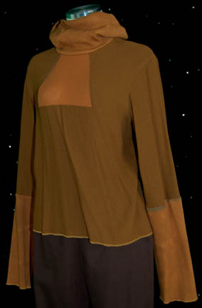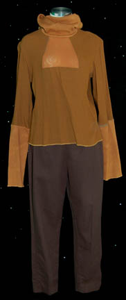 Description: A lot of items for wear in the eighth Star Trek feature film, “First Contact”; wherein the Borg travel back to Earth’s past and try to disrupt first contact with the Vulcans so the Federation will never have been established and the crew of the “Enterprise-E” follow them back to repair whatever damage they have done. This lot consists of two long-sleeved, pumpkin-colored, shirts featuring cuffs and a collar of a lighter colored textured fabric, a mesh-like panel under the collar; one of the shirts is distressed with fraying and minor tears where the other one has a much larger collar. A forest green corduroy vest featuring gray suede accents around the shoulders and down the front and noticeable fading either for effect or from time and storage; three matching brown trousers, one distressed, with stirrups for the feet, two pair of black socks, and weathered, brown leather boots. There is noticeable fading on the vest and slight fading on the cuffs of the shirt.